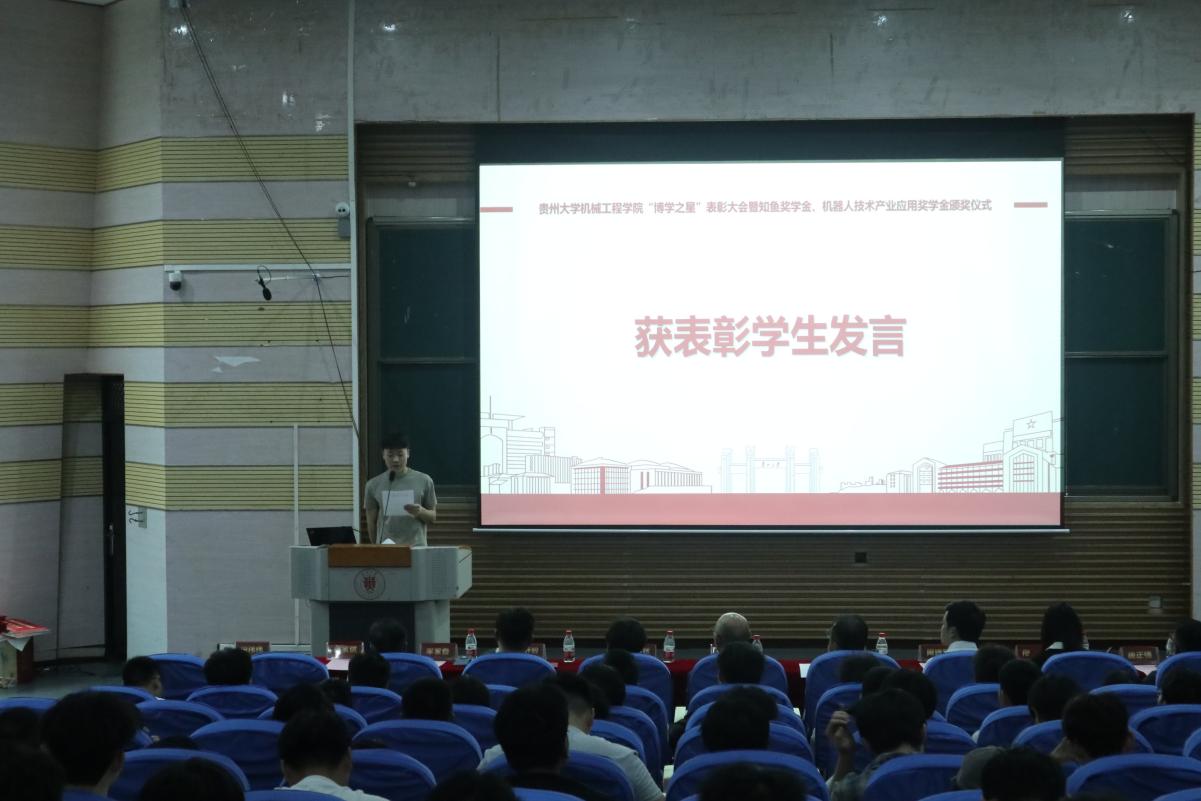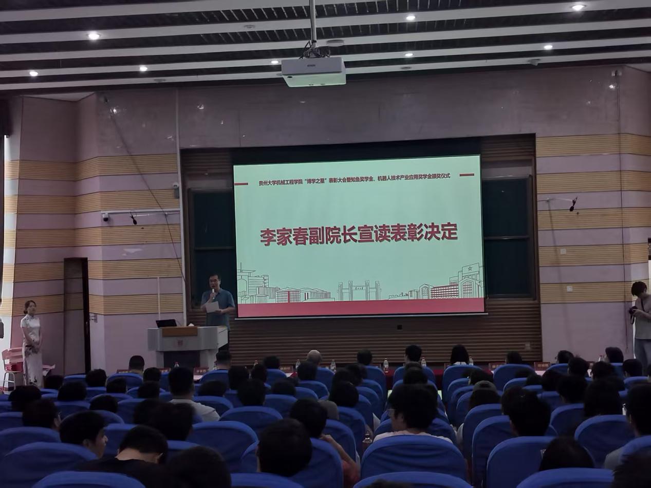 為表彰在學(xué)習(xí)成績(jī)、科研創(chuàng)新等方面有突出表現(xiàn)的畢業(yè)班同學(xué),2024年6月27日下午,貴州大學(xué)機(jī)械工程學(xué)院“博學(xué)之星”表彰大會(huì)暨知魚(yú)獎(jiǎng)學(xué)金、機(jī)器人技術(shù)產(chǎn)業(yè)應(yīng)用獎(jiǎng)學(xué)金頒獎(jiǎng)儀式在西校區(qū)117報(bào)告廳舉行。貴州捷盛鉆具股份有限公司董事長(zhǎng)韓陽(yáng)、重慶安尼森智能科技有限公司技術(shù)總監(jiān)周詩(shī)宇、貴州捷盛鉆具股份有限公司供應(yīng)鏈總監(jiān)安燕、國(guó)際業(yè)務(wù)二部部長(zhǎng)周舒毅、企劃部主管田偉偉與機(jī)械工程學(xué)院黨委書(shū)記趙津、正處級(jí)組織員董蔚然、黨委副書(shū)記廖燁、副院長(zhǎng)李家春、副院長(zhǎng)唐正強(qiáng)出席會(huì)議,學(xué)生科全體輔導(dǎo)員、獲獎(jiǎng)學(xué)生代表及兩百余名機(jī)械學(xué)子參會(huì),大會(huì)由學(xué)生科副科長(zhǎng)王嘉斌主持。