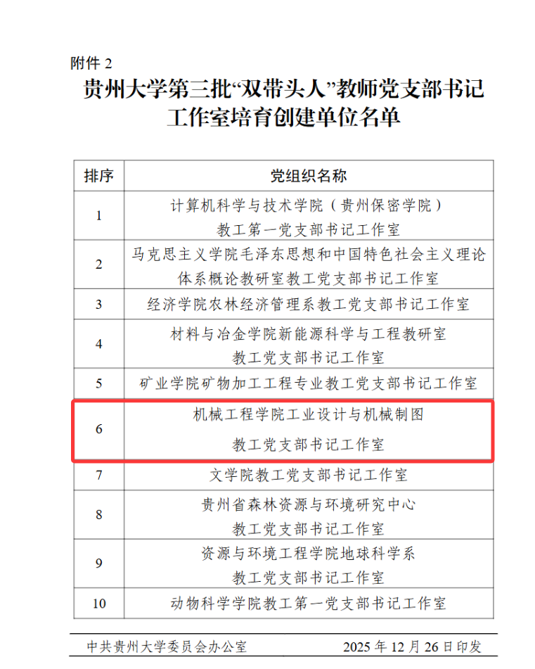 2025年12月,經(jīng)基層黨委把關(guān)推薦、專家評(píng)審、校黨委黨建工作領(lǐng)導(dǎo)小組辦公室審議、校黨委黨建工作領(lǐng)導(dǎo)小組審定,貴州大學(xué)第四批黨建工作“標(biāo)桿黨委”“樣板支部”和第三批“雙帶頭人”教師黨支部書記工作室培育創(chuàng)建單位名單發(fā)布,我院工業(yè)設(shè)計(jì)、機(jī)械制圖教工黨支部喜獲貴州大學(xué)第三批“雙帶頭人”教師黨支部書記工作室培育創(chuàng)建單位。